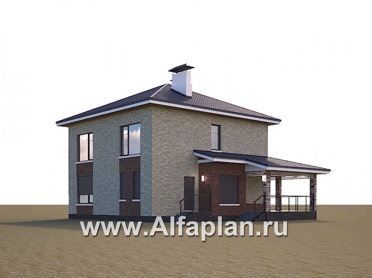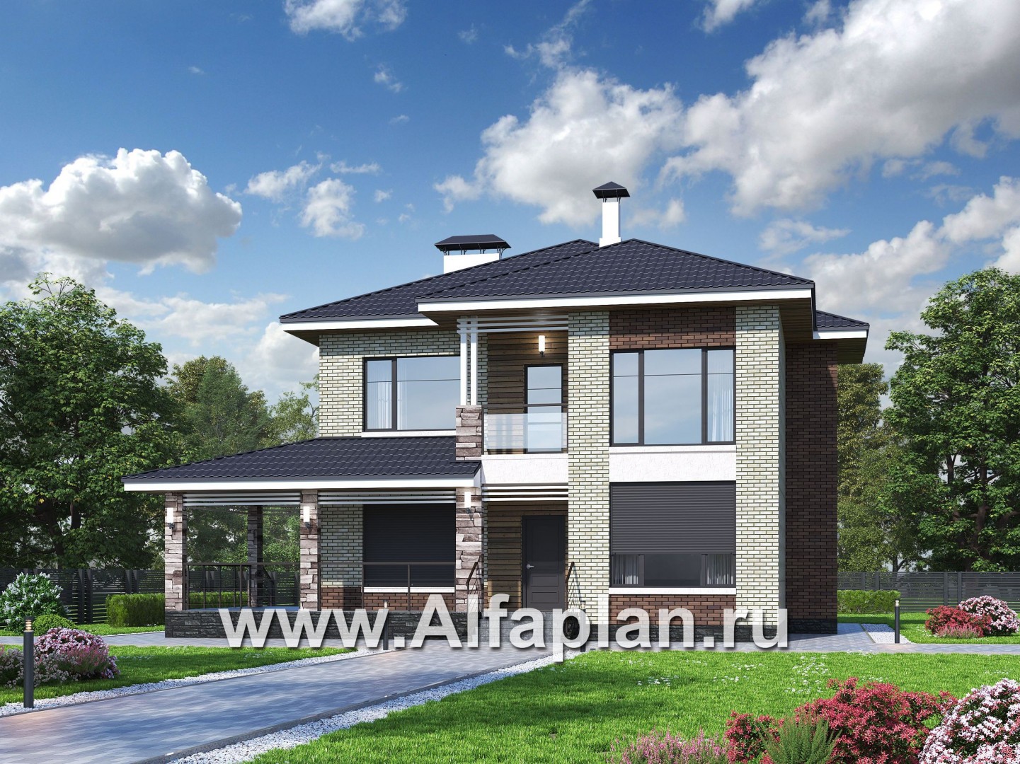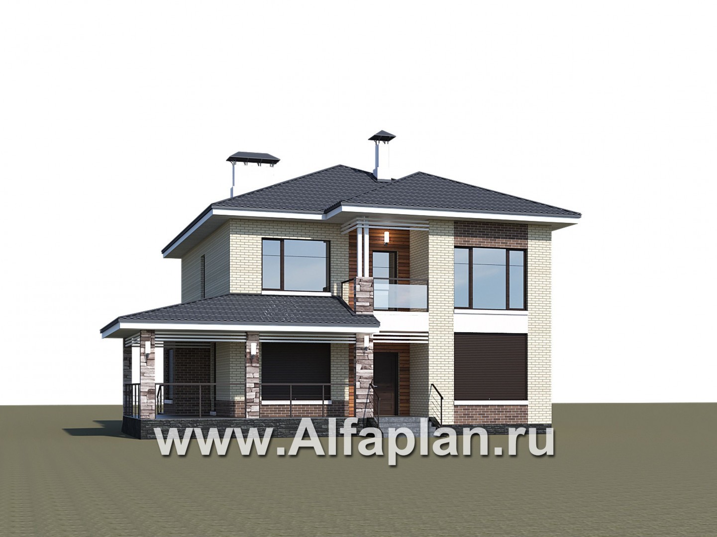695A-R «Роман с камнем» — проект двухэтажного дома, с террасой, со скрытой установкой ролет на окнах 1-го этажа