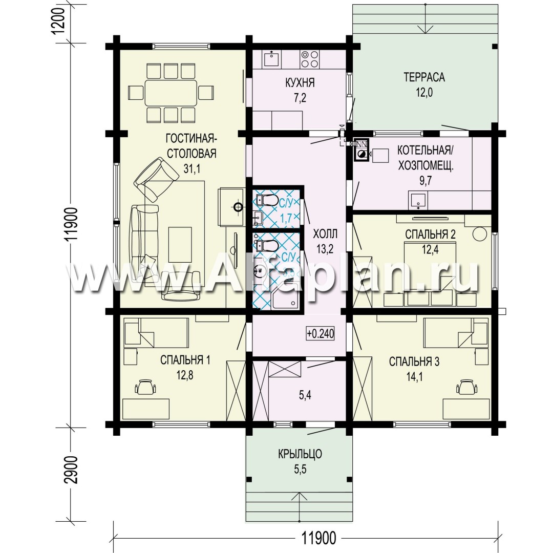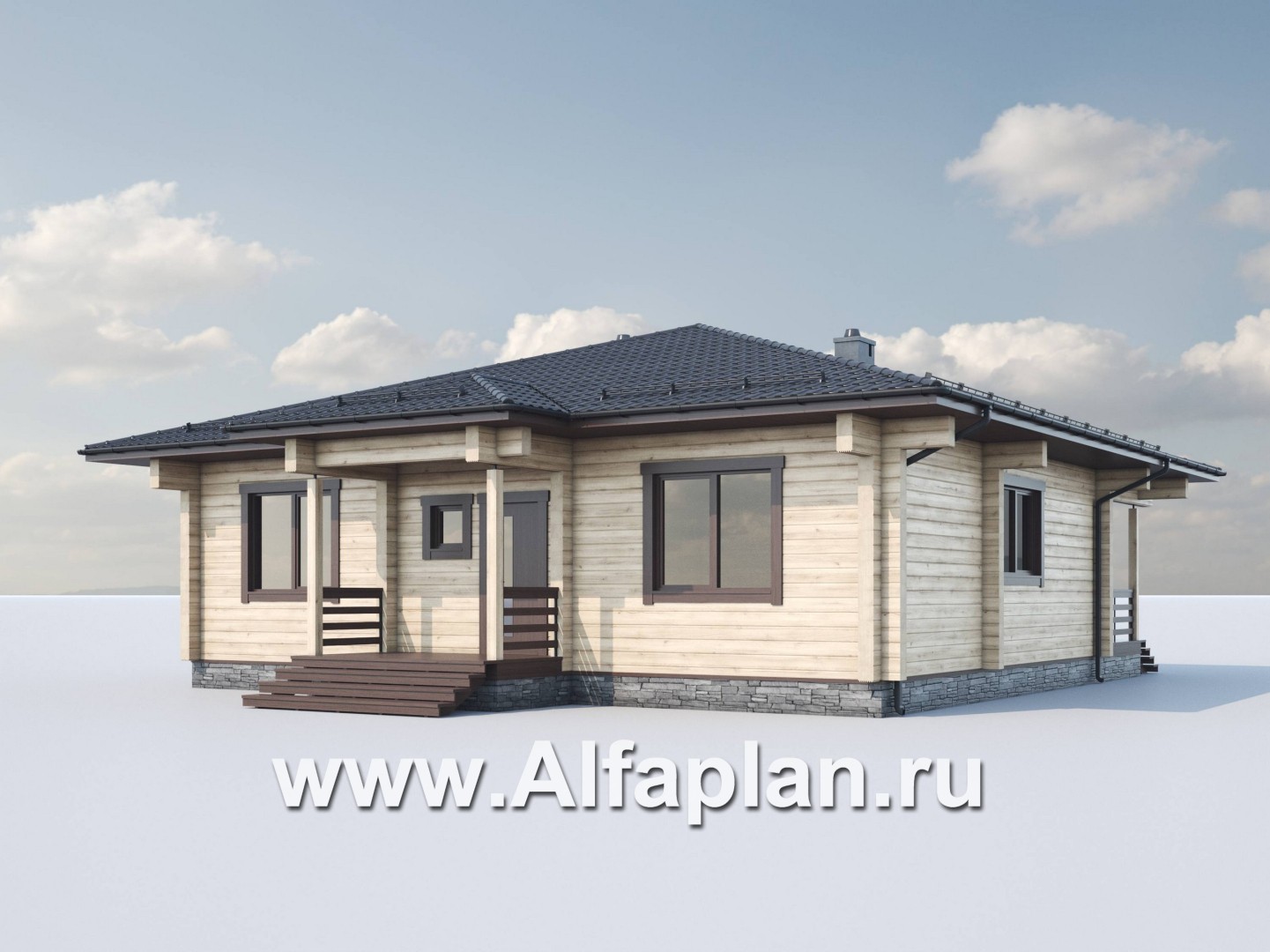 Проект одноэтажного дома из бруса, 3 спальни, дача с террасой, коттедж для отдыха
