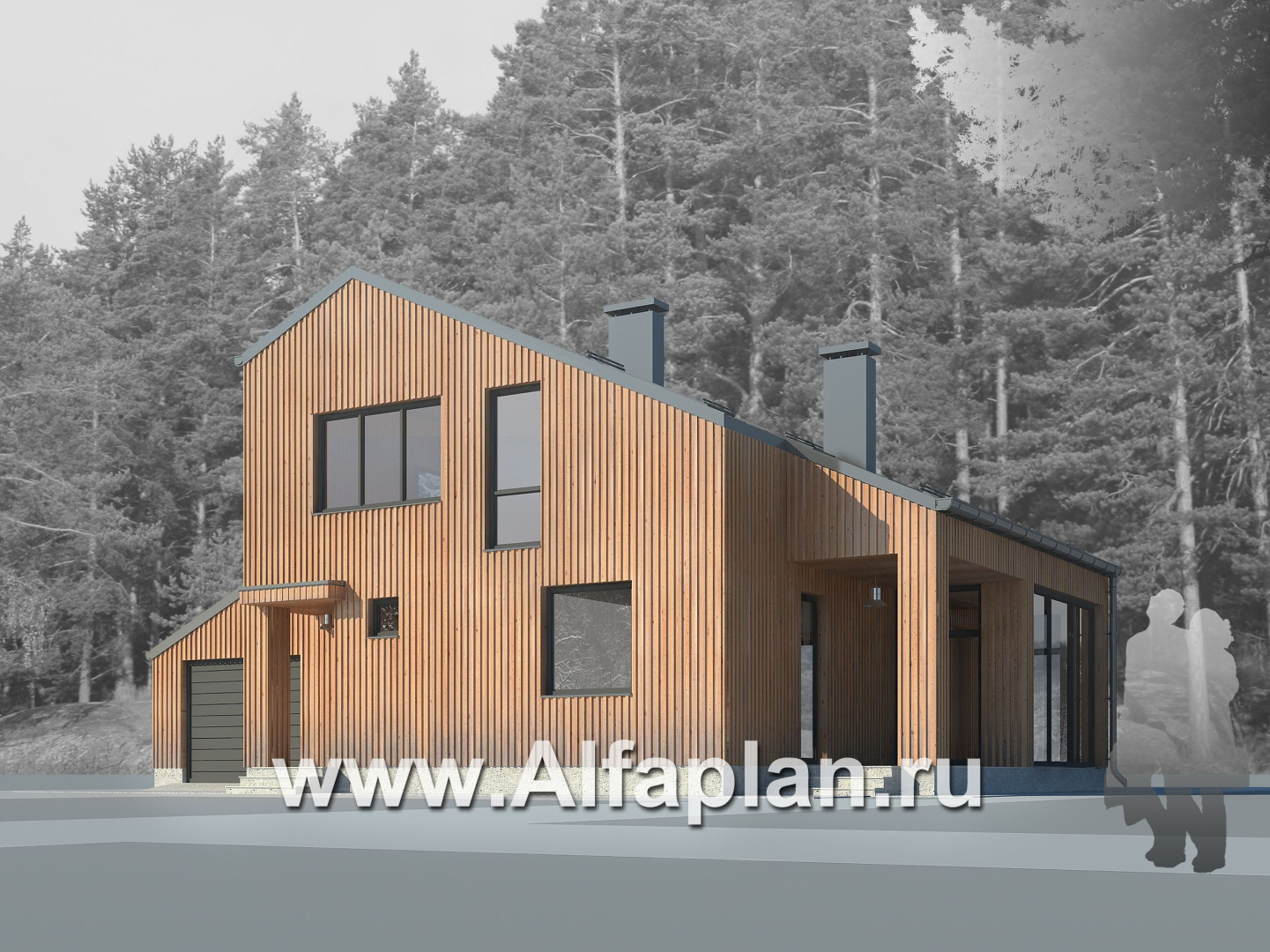 Проект дома с мансардой, планировка с кабинетом и с гаражом на 1 авто, в современном стиле