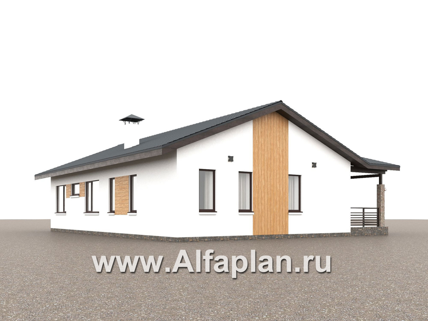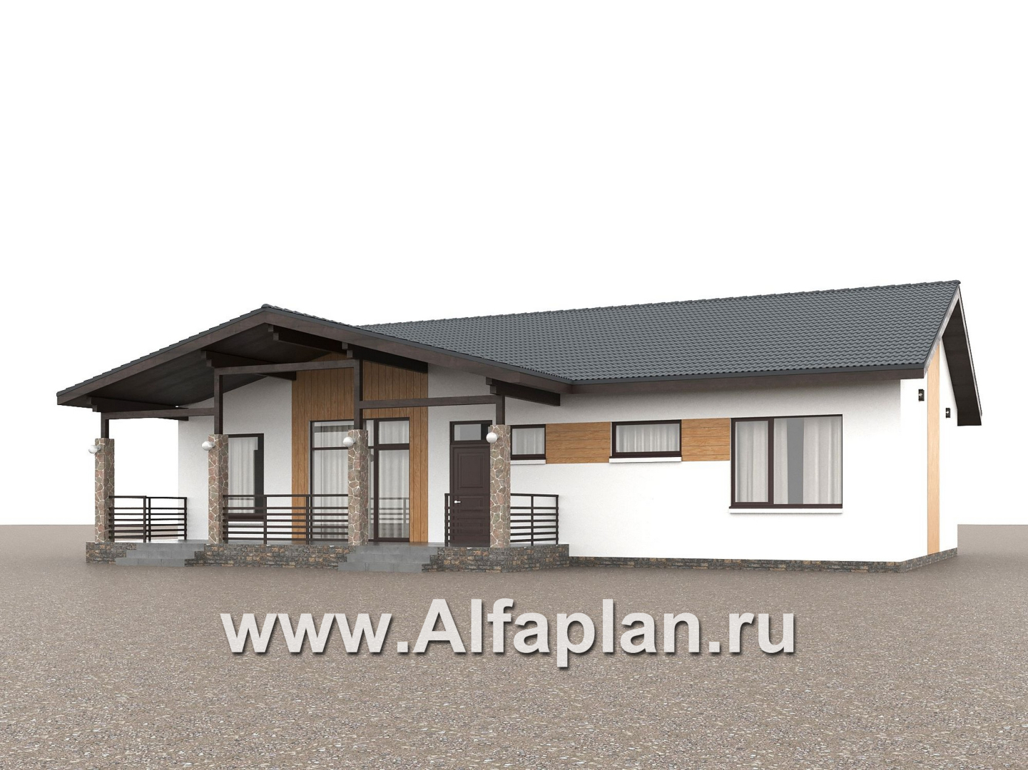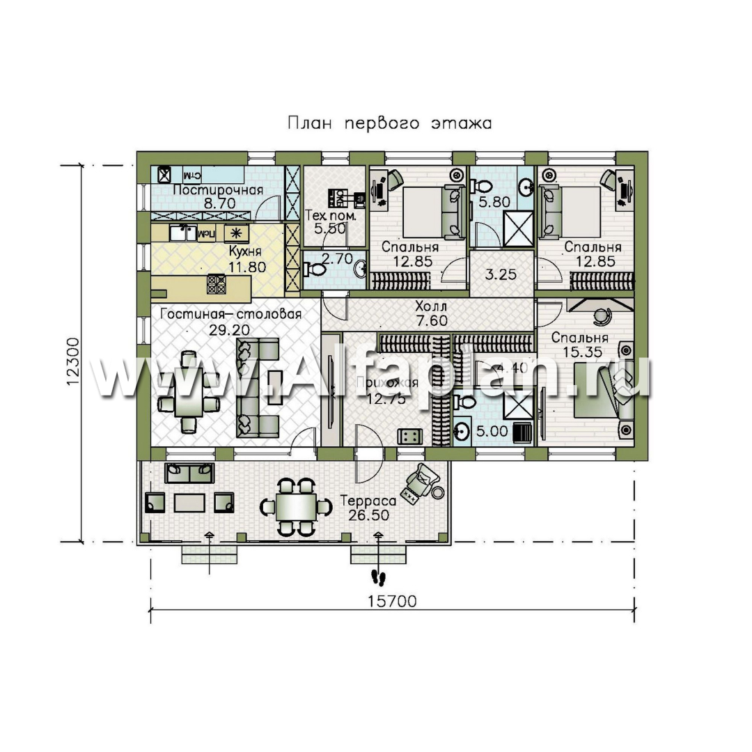 «Золотые поля» - проект одноэтажного дома, планировка мастер спальня и две детских, терраса со стороны входа