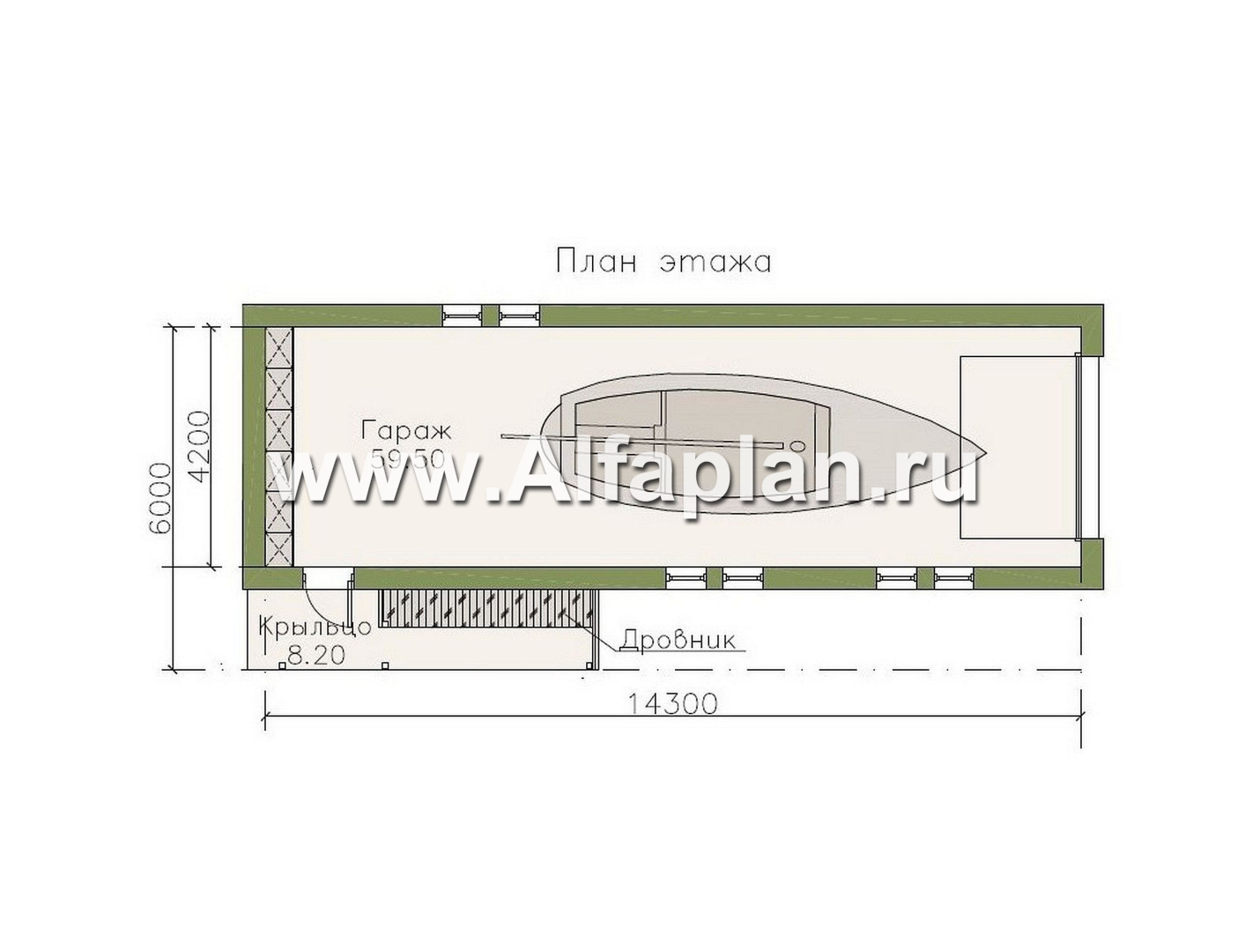 Гараж имеет одни ворота и отдельный вход, в нем последовательно помещаются два автомобиля. Возможно держать в нём и другие транспортные средства: мопеды, скутеры, электрокары. Если дом построен вблизи водоёма и у хозяина есть лодка, её также можно хранить здесь.