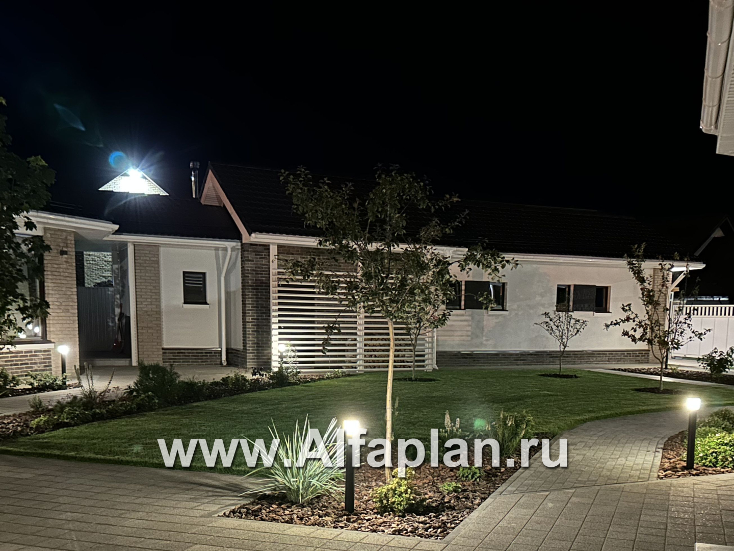 Длинный гараж 218Р с одними воротами — прямоугольная в плане постройка из газобетона на монолитной железобетонной фундаментной плите, крытая битумной или натуральной черепицей. Внешняя отделка его довольно нейтральна, что позволит удачно вписать ее в архитектурный ансамбль приусадебного участка. Светлая декоративная штукатурка окантована вертикально облицовочным кирпичом и подчеркнута камнем цоколя.