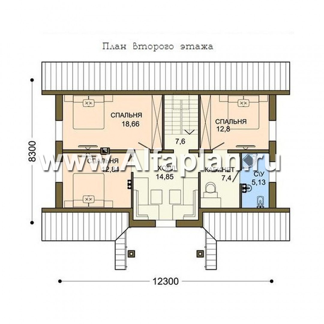 На втором этаже расположены три больших спальни, компактный кабинет, граничащий с санузлом. В центре дома есть большой холл, в котором можно оборудовать еще одну гостиную или просто место для отдыха.