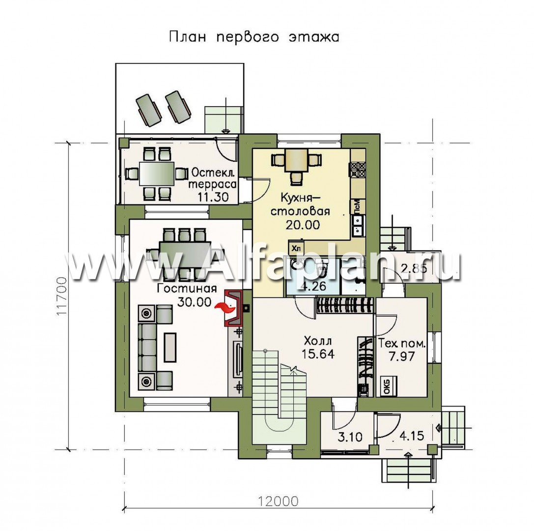 Первый этаж этого кирпичного (газо-, пенобетонного) дома отдан под гостевую зону. Левое крыло занимают холл с лестницей на второй этаж и кухня-столовая, правое – оборудованная камином светлая гостиная. Из кухни-столовой можно попасть на остекленную террасу, снабженную собственным выходом во двор. На террасе найдется место для дополнительной обеденной группы.