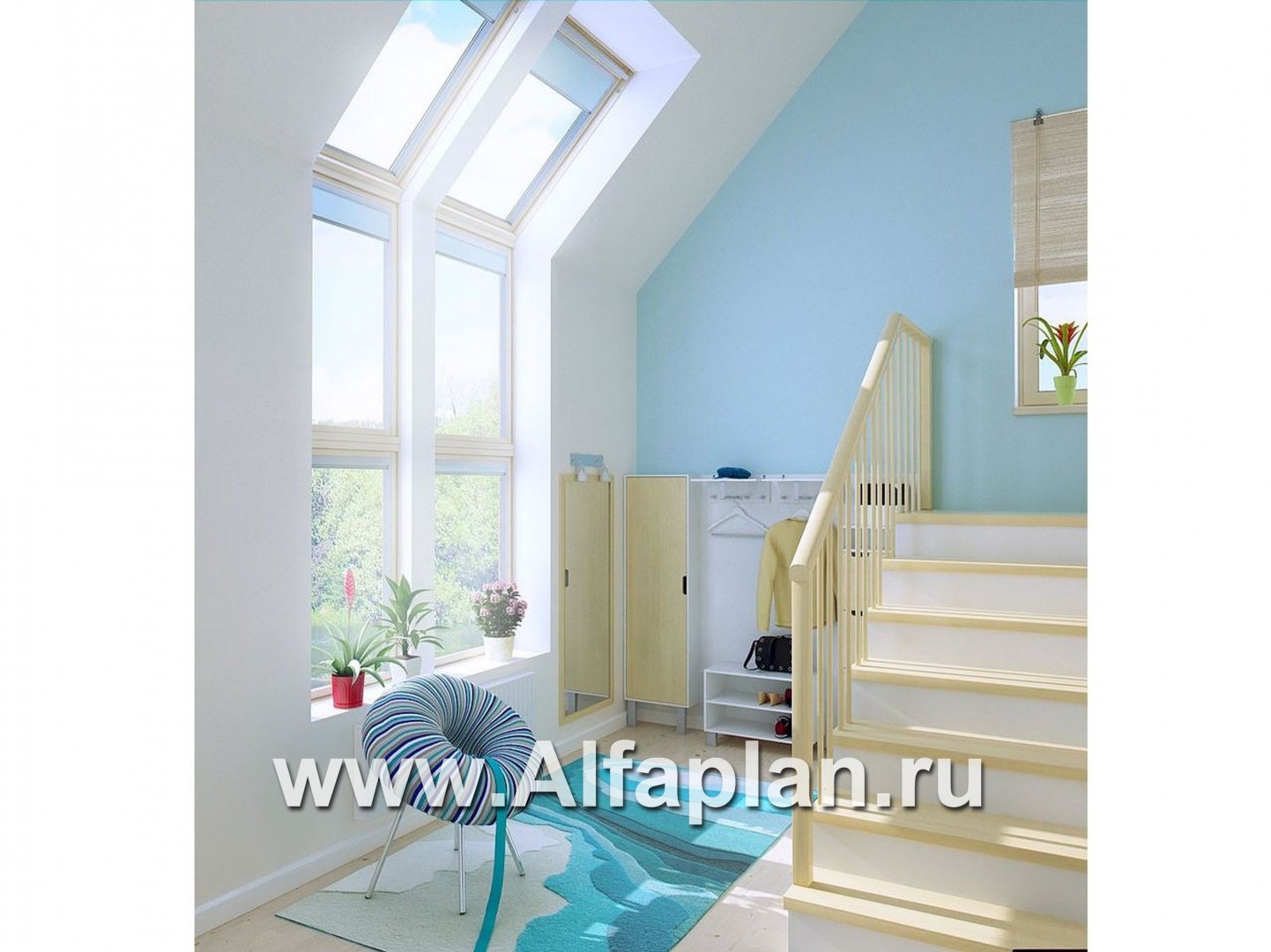 Через лестницу на второй этаж мы попадаем в холл со вторым светом. Отсюда по коридору можно зайти в одну из трёх просторных спален площадью 18, 19 и 21 м2. Здесь же, на втором этаже, санузел площадью 4,5 квадратных метра. Из малых спален есть отдельные выходы на полукруглый балкон.