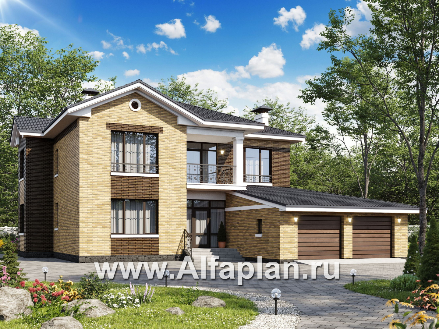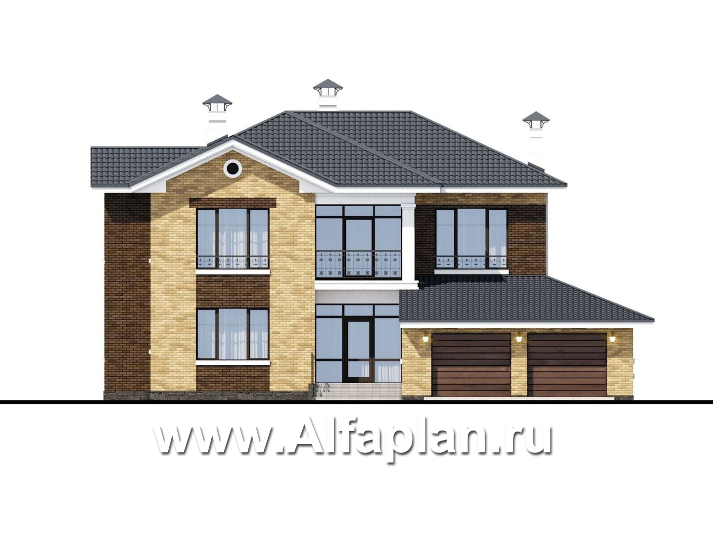 519B-2-S «Орлов» - проект двухэтажного дома из кирпича, с террасой и балконом, планировка с лестницей в центре, с гаражом на 2 авто
