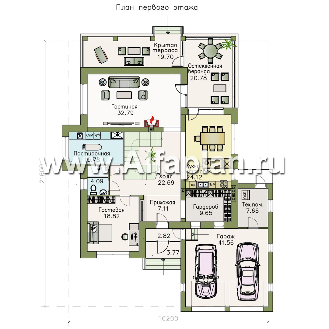 Чертежи проекта говорят о поэтажном разделении дневной и ночной зон. Наличие капитального гаража на два автомобиля решает транспортную проблему, обязательно возникающую при жизни за городом. Особенно стоит отметить наличие в доме не только крытой террасы, имеющей выход в сад, но и остекленной веранды, что будет служить изящной обеденной зоной хозяевам круглый год.