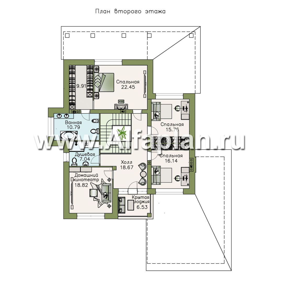 На втором этаже расположены три спальни, оборудованные встроенными платяными шкафами. Две одинаковые по площади и третья наибольшая — хозяйская (в ней есть отдельный большой гардероб). Просторный холл, где можно посидеть в мягком уголке или выйти на уютную лоджию, ведет в помещение небольшого домашнего кинотеатра. Ванная с душевой, джакузи и санузлом также находятся в холле за лестницей и предназначены для общего пользования.