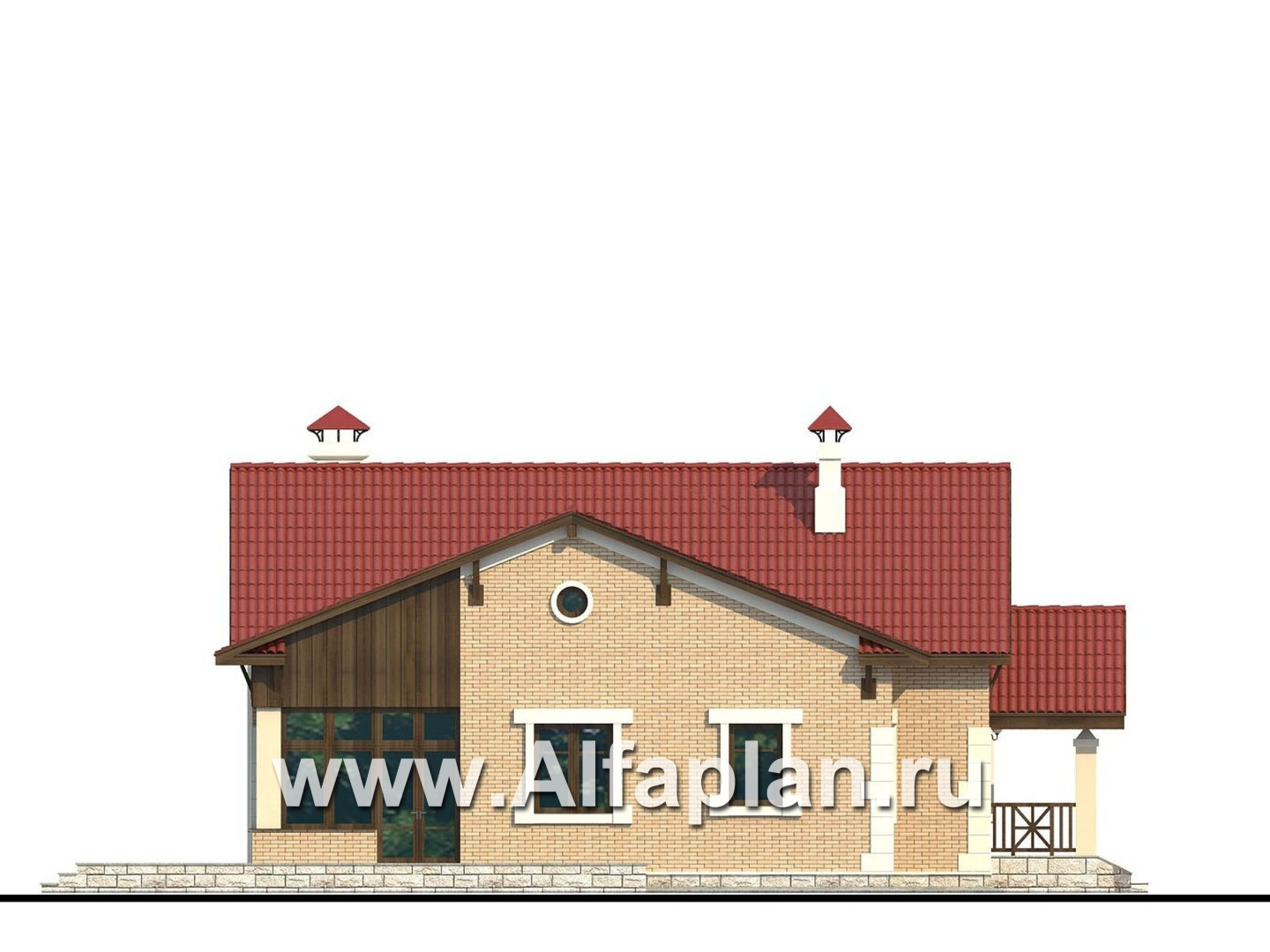 Центральное место занимает большая светлая гостиная. Через открытый арочный  проем  она соединяется с зимним садом и кухней. Из зимнего сада есть выход на открытую террасу - отличное место для барбекю.  Высота  гостиной составляет 5.25 м. Это практически двусветное помещение с красивым оконным витражом на всю высоту, обращенным в сад. Для придания уюта в гостиной  установлен камин. В проекте гостиная объединена с коридором в одно помещение, если появится желание - их можно отделить  интересной  перегородкой  из вьющихся  растений, либо выбрать для этого другое  дизайнерское  решение.  Кухня со столовой  также объединены  в одно пространство. Перегородка  между ними отсутствует. Такой прием помогает сохранить полезную площадь и одновременно зрительно ее увеличить. В кухню-столовую можно войти как из прихожей, так и из гостиной. В самостоятельный блок выделена спальная зона. Она включает в себя четыре спальни, большую ванную комнату и прачечную. Смежные спальни разделены перегородками, от которых при необходимости можно отказаться. Высота этих помещений - 3.53 м. Удобно решена входная зона дома. Здесь расположена прихожая, котельная, санузел и просторная, светлая гардеробная. В прихожей предусмотрен  лаз на чердак. Со стороны зимнего сада к дому примыкает большая открытая терраса, которая связывает внутреннее  пространство дома и природное  окружение. В данном проекте существует зеркальное изображение строения. Это поможет вам правильно подобрать местоположение вашему коттеджу на участке.