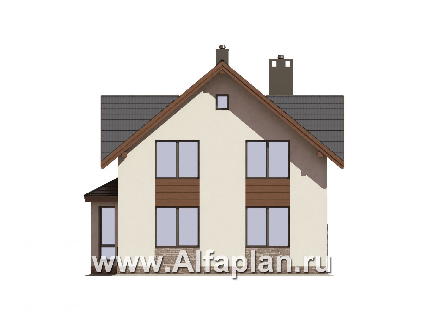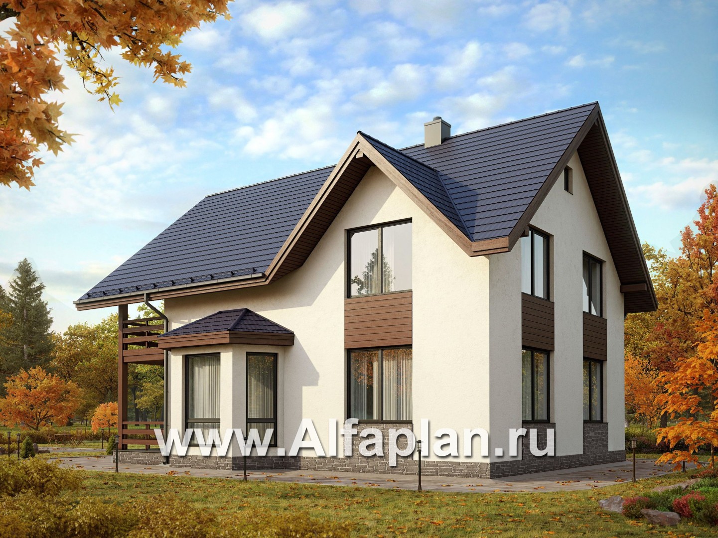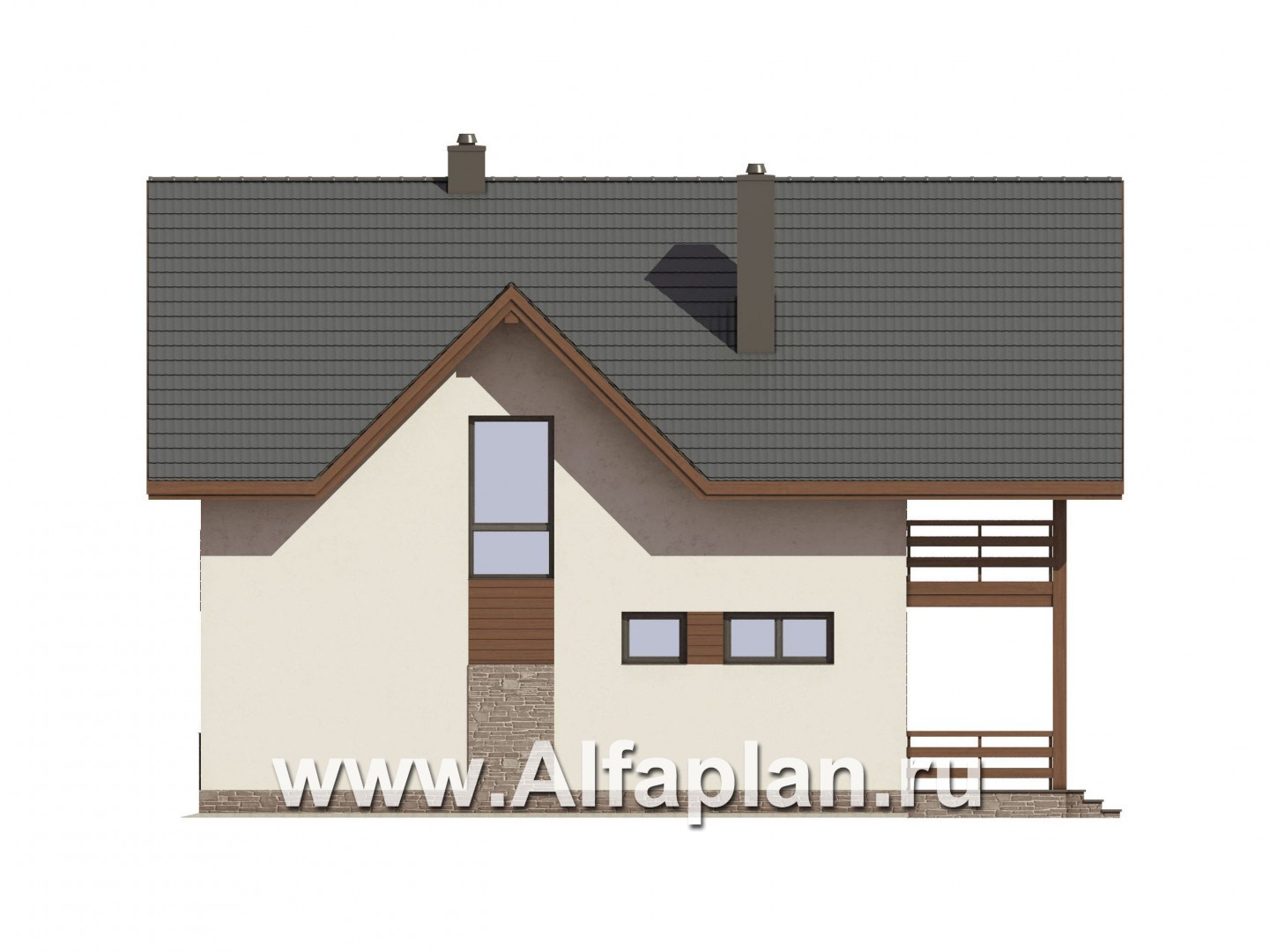 Проект частного дома с мансардой, 3 спальни, с камином и эркером, гостевая комната на 1 эт, терраса и балкон со стороны входа